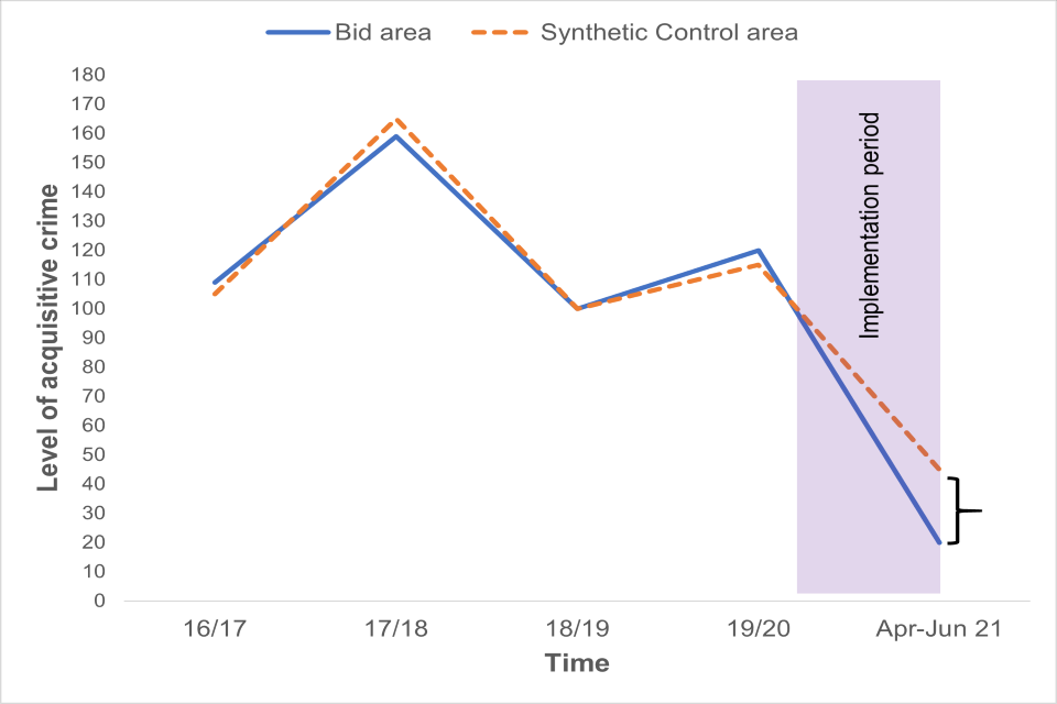 Kantar Public used a time series of police recorded acquisitive crime data to analyse the preliminary impact of the fund. The admin data period for this preliminary analysis was based on April to June 2021. Further impact analysis is planned with a longer follow-up period based on a year of data (1 April 2021 to 31 March 2022). The team used the synthetic controls method (Abadie, 2010)[footnote 8] to generate a control group for each of the successful SSF bid areas, considering crime rates and a variety of population statistics in the matching criteria using historic DataHub data (covering years ending 31 March 2017 to 2020). This method uses a weighted average of multiple control areas (census Lower Layer Super Output Areas or LSOAs[footnote 9]) to create an artificial control group, whose trend (in police recorded crime) before introducing the fund is closely matched to the trend in the SSF bid area.
