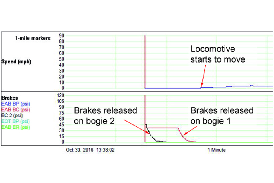 Graph showing the brake pressure and locomotive speed as recorded by the locomotive’s data recorder. The points at which the brakes were released on the two bogies and the point at which the locomotive starts to move are indicated by red arrows.