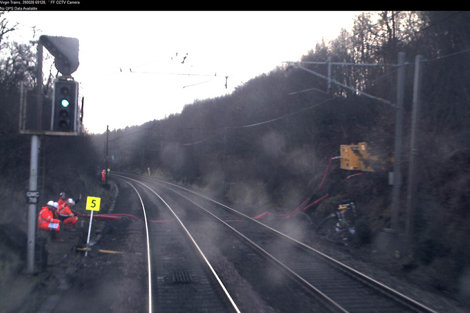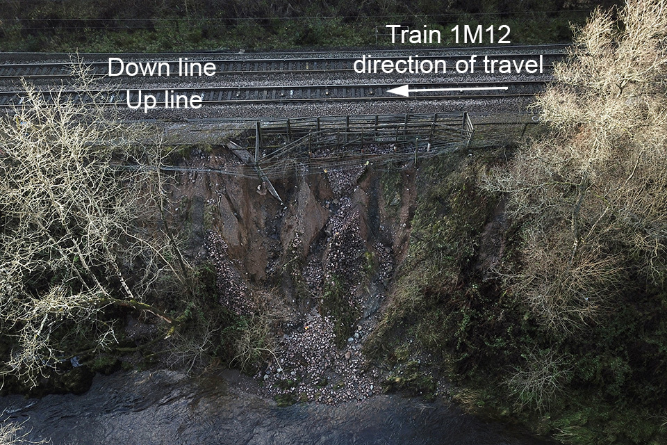 Maintenance staff subsequently found that the culvert was blocked and that the flow of water down the track had caused the embankment on the east side of the line to fail over a length of about 15 metres, at 40 miles 1400 yards. A previous failure had occurred in the same place in December 2013. After this earlier failure, Network Rail had fitted monitoring equipment to the track running alongside the top of this section of embankment. However, it did not receive any alarms from this monitoring equipment as the track had not been affected by this latest embankment failure.