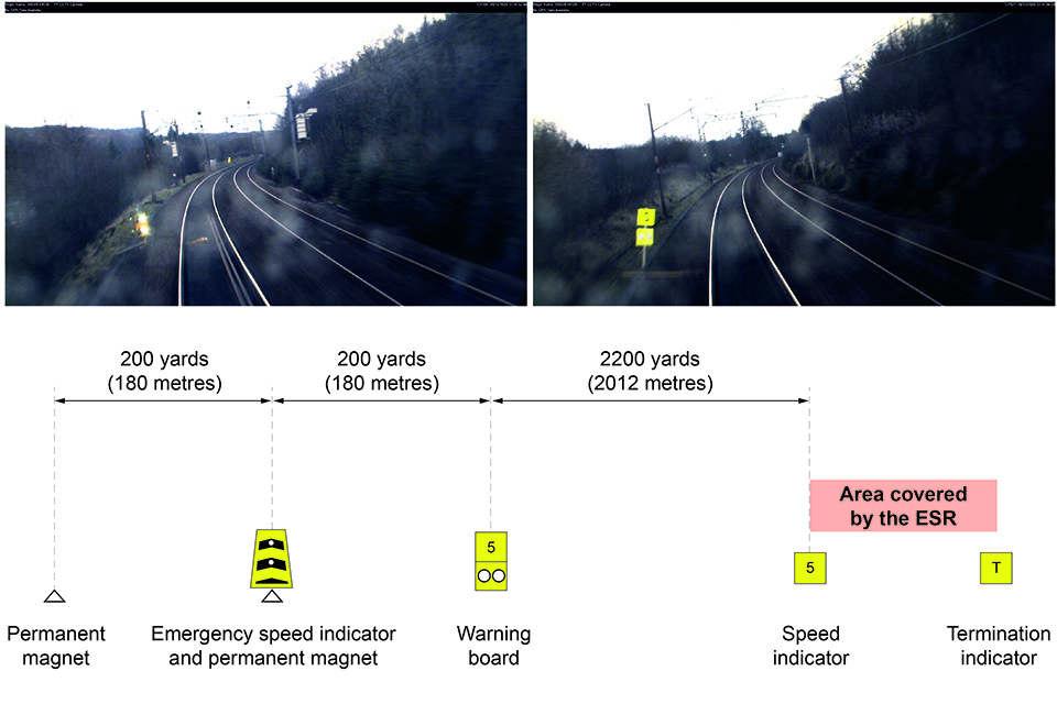The layout of the trackside equipment for the ESR with forward-facing CCTV images from train 1M12 showing the emergency speed indicator (top left) and warning board (top right) (images courtesy of Avanti West Coast)