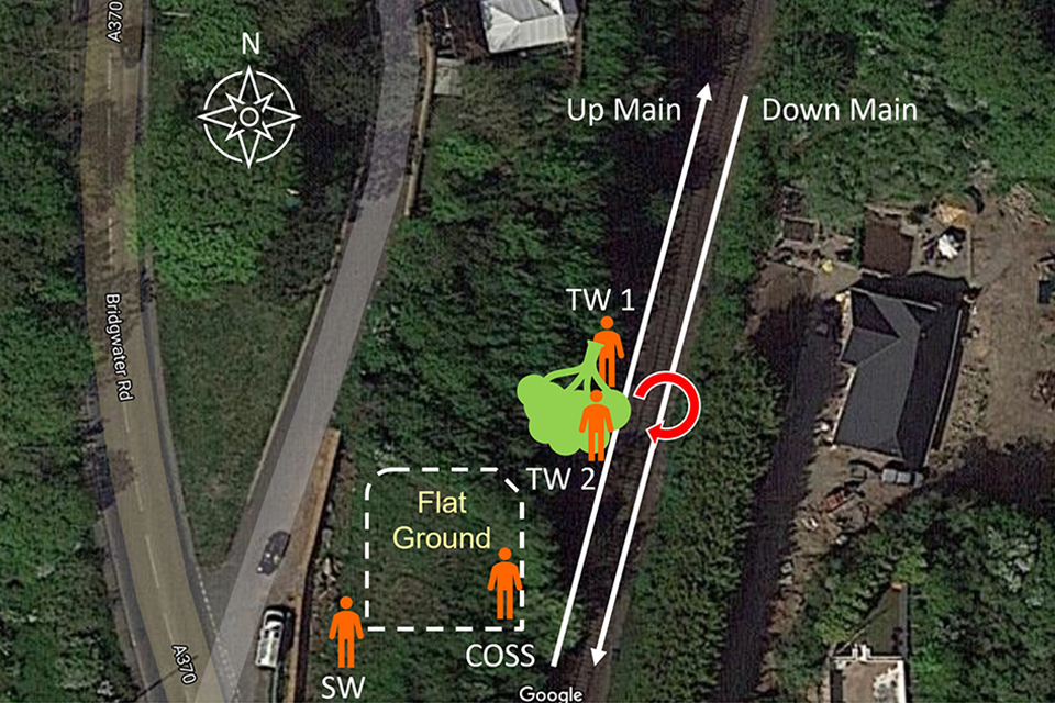 The train involved left Taunton at 12:54 hrs and was travelling near to the 100 mph (160 km/h) maximum permitted line speed when the driver observed track workers on the line ahead. The driver sounded the train’s horn approximately 10 seconds before reaching the track workers with the expectation that they would move to a position of safety, where it would be safe to stand as the train passed. The track workers, however, did not acknowledge the warning, or move off the line, so the driver sounded the horn for a second time and applied the train’s brakes. The track workers became aware of the presence of the train after warnings being shouted by the Controller of Site Safety (COSS), who stated that he had been attempting to call the signaller when the train approached. The track workers moved to the cess and clear of the line approximately 2 seconds before the arrival of the train, which then struck the tree. Although the track workers were close to the tree at the time of collision, nobody was injured.