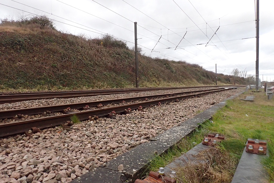 Image captured of Ponton Yard access point from a train travelling south on the Up Fast line. From left to right can be seen the access gate, the permanent road-rail access point on the Up Slow line, the Up Fast line and the Down Main line. (Image courtesy of Network Rail.)