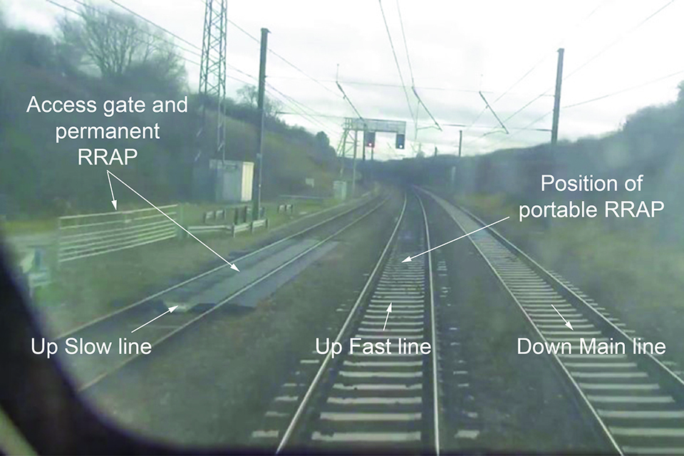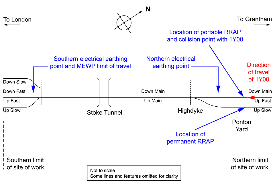 Ponton Yard has a track access point with a permanent RRAP located on the Up Slow line. There was no permanent RRAP on the fast and main lines where the inspection work was to be carried out. The exact method of putting the MEWP on to the track and the equipment to be used was not specified in the safe work pack, although an accompanying work plan stated that a ‘suitable RRAP/temporary RRAP/level crossing’ was to be used. On the way to the site of work, the team assigned to the task discussed the use of a portable RRAP to put the MEWP directly on to the Up Fast line instead of using the permanent RRAP on the Up Slow line. This would negate the need to move a set of points at Highdyke, approximately 500 metres to the south of Ponton Yard, to join the Up Main line.