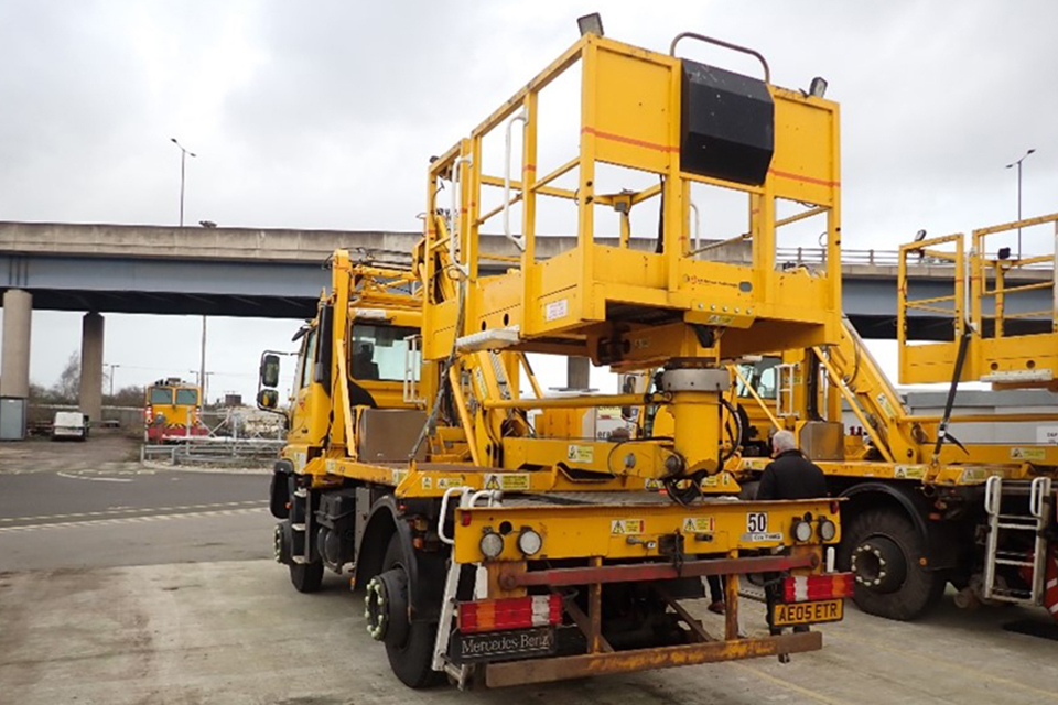 A Network Rail road-rail vehicle with a mobile elevated work platform and basket as used on the East Coast Main Line for overhead line equipment inspections.