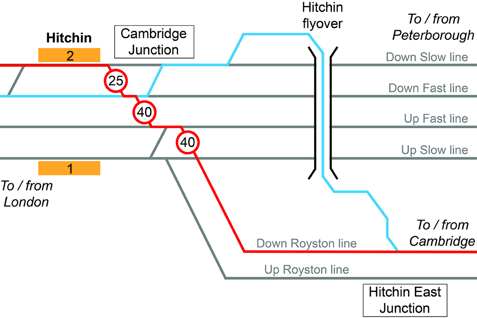 Train 1T20 departed from London King’s Cross station on time and travelled on the Down Fast line until just south of Stevenage. Here the signaller advised the driver that the line ahead was blocked by a failed train and that their train would be diverted onto the Down Slow line. This meant train 1T20 followed a stopping service, which was also going to Cambridge. To get the two trains back into their timetabled order, and to avoid further delaying train 1T20, the signaller routed the stopping train via the Hitchen flyover so it could then be held at Hitchen East Junction. This would allow train 1T20 to overtake it by crossing Cambridge Junction and proceeding along the Down Royston line.