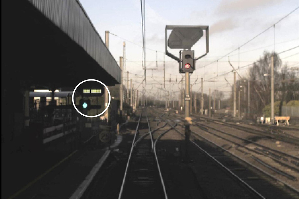 As train 1T20 approached Hitchin, it passed YB1481 signal (the signal preceding YB1507 signal) which was displaying a single yellow aspect. In response to this, the driver applied the train’s brakes and slowed down from 70 mph (113 km/h) to about 25 mph (40 km/h). When YB1507 signal came into the driver’s view, it was displaying a red aspect. It then changed to display a green aspect with a position 5 junction indication. In response to this change of signal aspect, the driver demanded traction from the train, and it began to accelerate. At this point the train was about 585 metres from the signal. By the time the train arrived at the signal, about 32 seconds later, it was travelling at 56 mph (90 km/h).