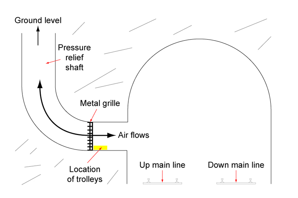 The accident occurred because the trolleys had been stored in the tunnel recesses without being adequately secured and the airflow generated within the pressure relief shafts was large enough to lift and move the trolleys onto the track.