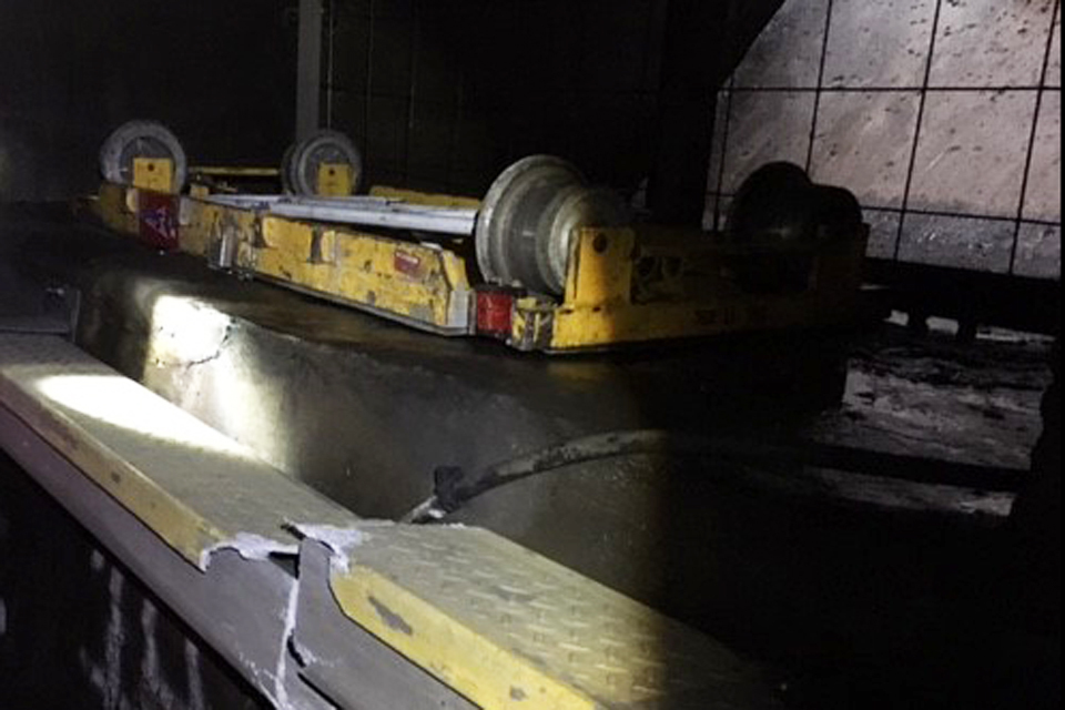 Undamaged trolley as found within the pressure relief shaft No. 1 recess in Stowe Hill Tunnel. The metal grille at the bottom of the shaft can be seen in the background (photo courtesy Network Rail)
