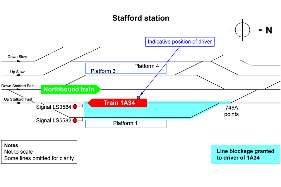 About five minutes later, at 14:16 hrs, the signaller called the driver back to grant the line blockages. When he arranged the line blockages with the driver, he modified the start of the line blockages to a set of points at a junction to the north of the station. The line blockages ended at signals at the southern end of the station. These arrangements blocked the Up Stafford Fast line (the line on which train 1A34 was standing) and the line through platform 1. The signaller believed this would be sufficient for what the driver needed to do, so at the end of their conversation he gave the driver an authority number for the line blockages, which the driver repeated back and recorded. However, the signaller should not have granted a line blockage for the Up Stafford Fast line as section 13 of Rule Book module TS1 ‘General signalling regulations’ states that a line can only be blocked when it is clear of trains. This line was not clear as train 1A34 was standing on it. Also the presence of the train in this section of line meant the signalling system would not allow any other trains to be signalled into it.