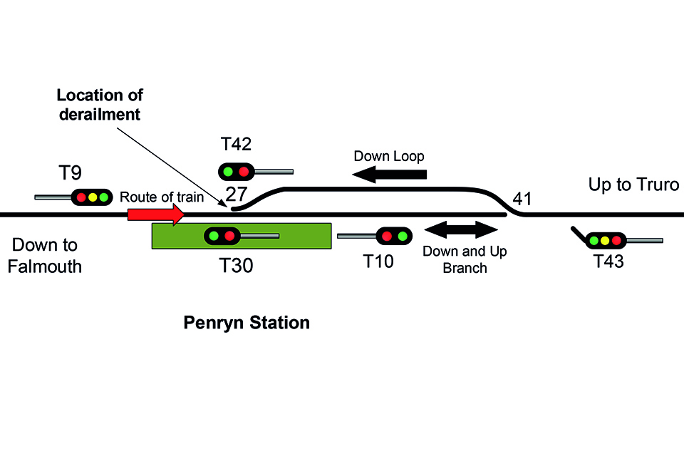 At around 12:30 hrs, train 2T76, the 12:20 hrs service from Falmouth to Truro, was entering the station at Penryn, Cornwall, when the first bogie of the leading coach became derailed while the train was travelling at about 16 mph (26 km/h). The train, which was formed of a two-coach diesel multiple unit, was passing over a set of facing points at the time, and it came to a stop with the leading coach straddling both routes. The 14 passengers on the train were able to alight onto the station platform, and continued their journeys by road.