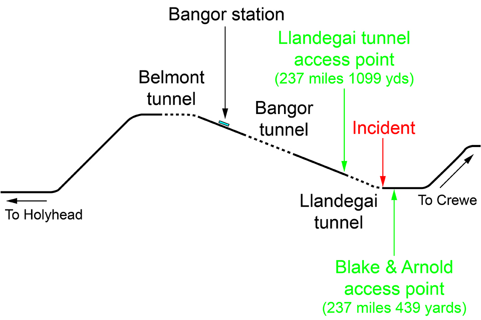 The COSS had not been to Llandegai tunnel before and had used an online Network Rail asset management database on the Friday evening to make a note of its location: 237 miles 572 yards. When he called the signaller, he said he was at 237 miles 444 yards, having possibly used a track location app to work this out. However, while the COSS and the track worker were close to these mileages, they were actually at ‘Blake & Arnold’ access point and not Llandegai tunnel access point. It is not clear why the COSS did not confirm the mileage of the Llandegai tunnel access point in the hazard directory.
