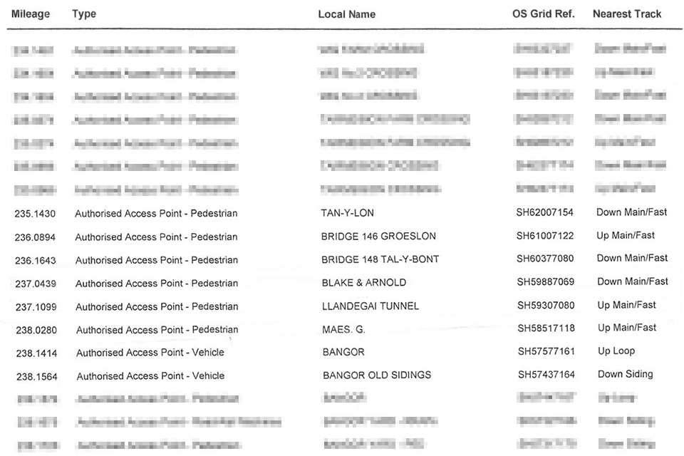 At site, the COSS referred to a list of access points in an extract of Network Rail’s hazard directory that he had brought with him, to confirm the names of the running lines. He picked out the access point named ‘Llandegai tunnel’ and, reading across, noted that the nearest track was the up line. Once out of his car, he showed this to the track worker. They both agreed they were at the Llandegai tunnel access point and, having taken the blockage, were safe to go on the line closest to them.