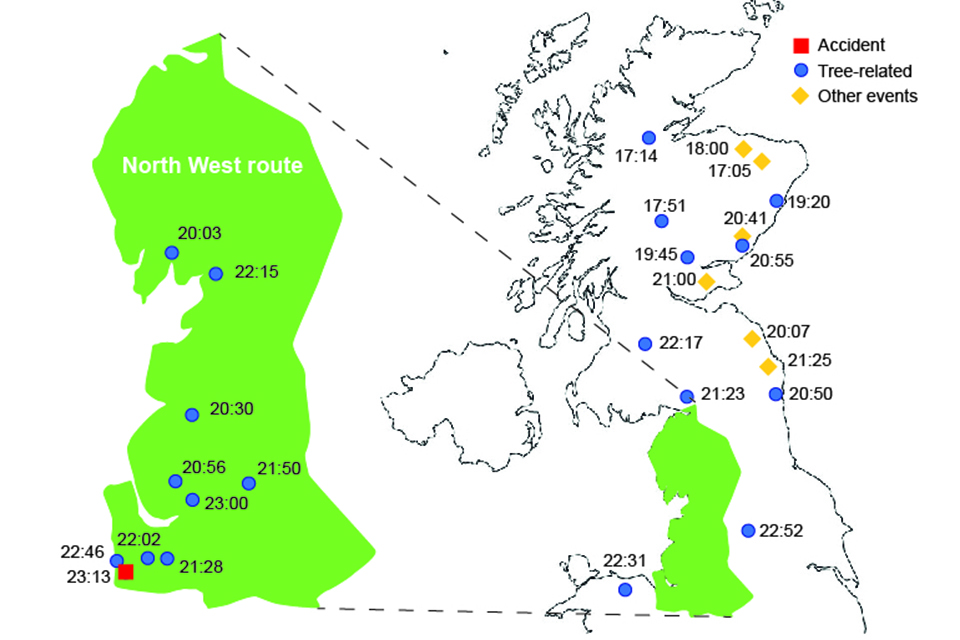 Storm Arwen had caused serious disruption on Network Rail infrastructure before the derailment of 5D77 at around 23:13 hrs. By this time, nineteen events involving falling trees had been reported on Network Rail infrastructure, including nine within the North West route. Before this derailment, North West route control staff were monitoring these events and had considered whether to apply BESRs. They decided against this, as they believed the incidents were mostly minor and manageable.