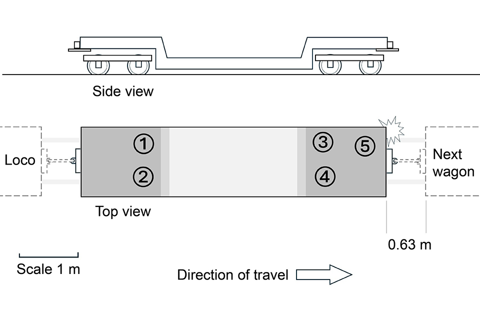 As the train approached the crossing and slowed down, the volunteer seated on the leading end of the well wagon, shown as position 5 in the diagram below, alighted from the train to open the gate. As they did so, their boot caught on either a track fixing or signalling equipment, dragging their leg under the wagon’s leading left-hand wheel. When the other volunteers heard the injured person shout, they all immediately alighted and instructed the train driver to reverse to release the injured person’s leg. As the train did so, the leading bogie of the incident wagon fully derailed.