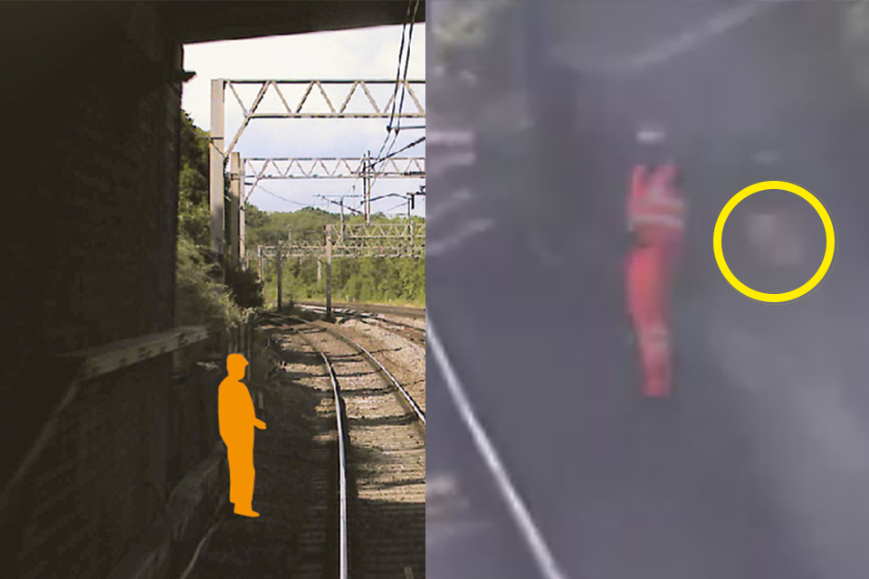 Images from the front (left) and rear (right) facing closed circuit television system of a northbound train taken at 16:28 hrs, showing the position of the track worker within an area of limited clearance, which is denoted by the sign in the yellow circle (images courtesy of Avanti West Coast).