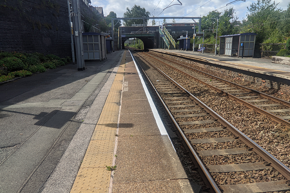 Eccles station platform 2 looking west, with bridge access in the distance
