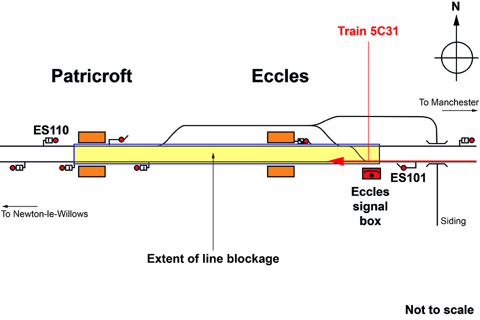 The line blockage covered both lines and was protected by signal ES101, just to the east of Eccles station and signal ES110, to the west of Patricroft station. The work was planned to run from 00:01 hrs to 05:00 hrs, with the line blockage being given up to allow trains to pass when required. Discussions between the COSS and the signaller at the start of the night confirmed that scheduled trains were running and that the work would need to stop and the line blockage be given up for each train.