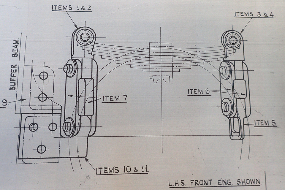 Extract from a drawing of the locomotive leading wheel suspension arrangement. The equalising beam which failed is not shown; the equalising beam hook engages with item 5 in the drawing (drawing courtesy of the Ffestiniog and Welsh Highland Railway)