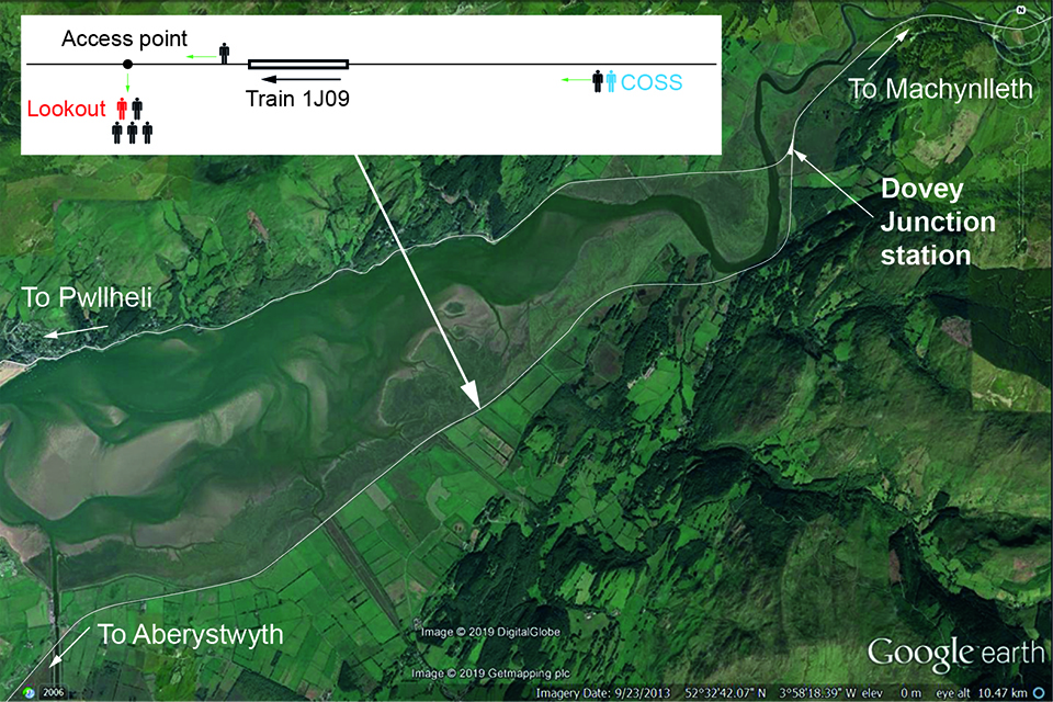 At around 11:45 hrs the work group got off the track when the lookout warned them of a train travelling towards Dovey Junction. On returning to the track they started to separate further. The Network Rail team leader has stated that he tried to call to those ahead, but was unable to get their attention. The RAIB found evidence that, while the team leader was conscious that train 1J09 would be waiting in the passing loop at Dovey Junction station, the lookout was not expecting there to be another train for around 45 minutes and may not have been regularly looking back. The lookout recalled the team leader mentioning the periodicity of trains when he briefed the work group as part of his COSS duties. It is possible that the lookout’s expectation was based on incorrect conclusions he had drawn from this.