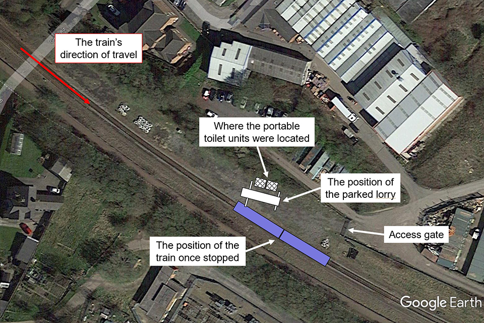 The position of the train and lorry after the accident (image courtesy of British Transport Police)