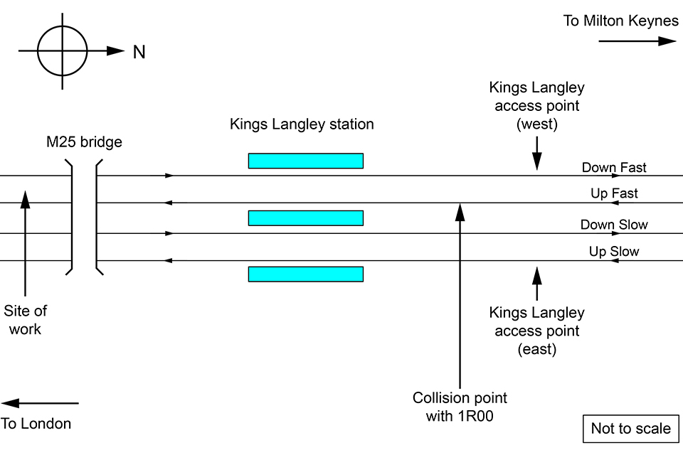 The Down and Up Fast lines at Kings Langley were under possession between 22:30 hrs on 24 April to 06:00 hrs on 25 April. Additional protection was to be provided by a possession of the Down Slow line from 00:45 hrs to 05:20 hrs on 25 April. No work was to take place on the Down Slow line, but the blockage of that line would give road-rail vehicles additional room to manoeuvre when on-tracking onto the adjacent Up Fast line. The Up Slow line remained open throughout, with a site warden being appointed to prevent track workers getting too close to the open line.