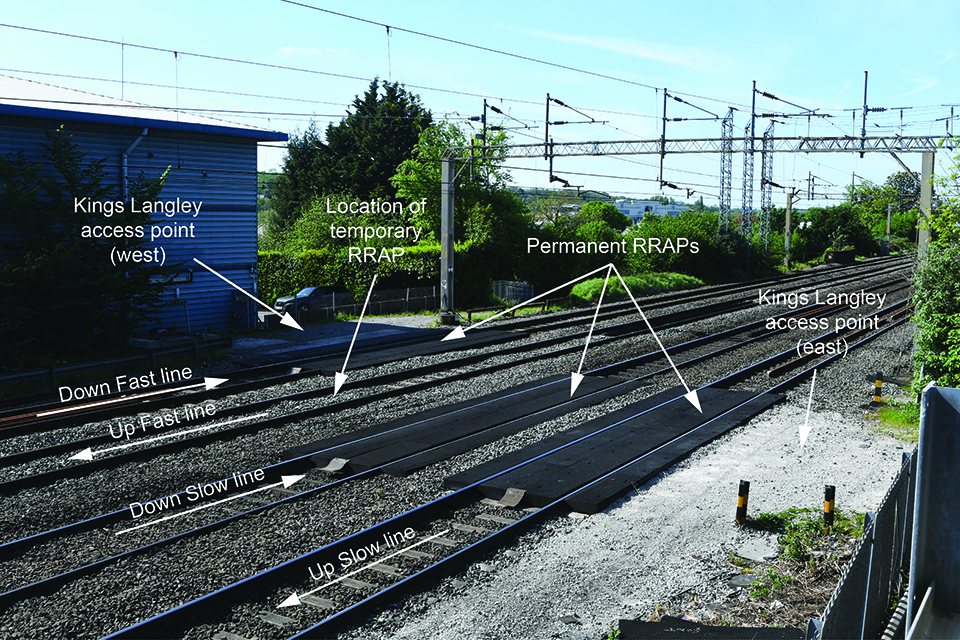 Kings Langley access point has a permanent RRAP on three of the four running lines. The permanent RRAP from the Up Fast line had been previously removed and stored near to the eastern access gate. The first MEWP was to be on-tracked using the permanent RRAP on the Down Fast line, accessed from the western gate. The second MEWP was to be on-tracked on the Up Fast line, which was also accessed from the western gate. The ‘on track plant’ work plan identified the missing RRAP and stated that a temporary RRAP was to be installed on the Up Fast line. The plan did not specify what type of temporary RRAP was to be used, how it was to be used, any restrictions which would apply to its use, or identify any risks associated with its use.