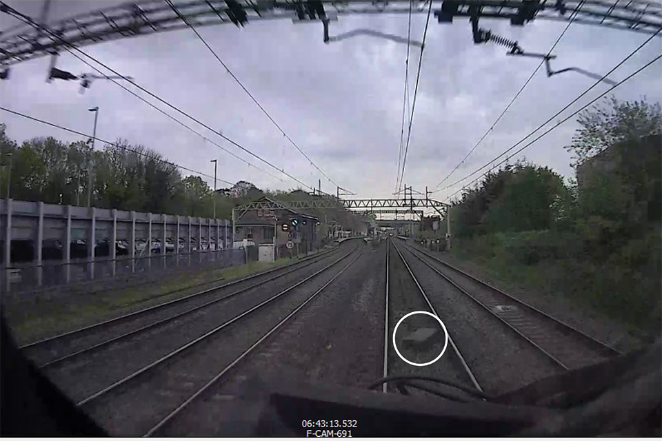 Forward-facing CCTV from the cab of train 1R00. The displaced piece of the temporary RRAP can be seen in between the running rails of the Up Fast line (courtesy of Avanti West Coast).