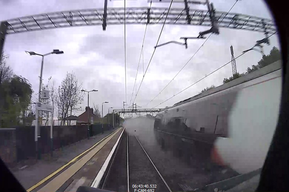 Forward-facing CCTV from 9S44 as it passes 1R00 through Kings Langley station. A dust cloud and debris is evident from the rear of 1R00 (courtesy of Avanti West Coast).