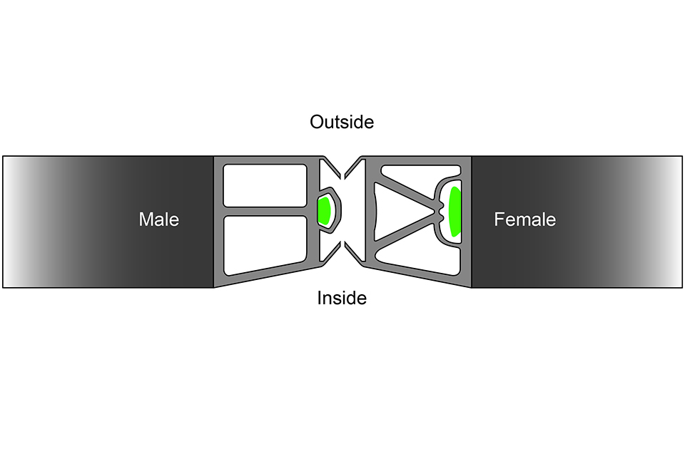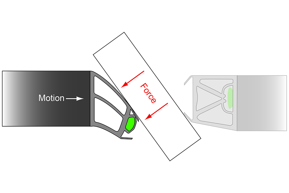 Cross-section showing the door edge seals housing the electrical sensing elements (shown in green)
