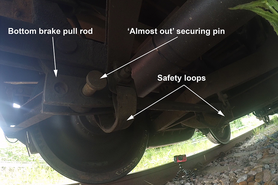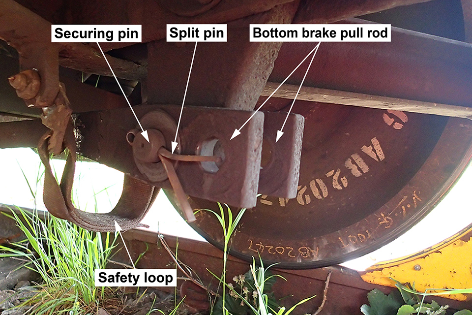 The bottom brake pull rod which fell from the wagon, and the bottom brake pull rod with the ‘almost out’ securing pin, were last disconnected from the braking system on 10 April 2019 when the associated wheelsets were replaced. New split pins should have been fitted when the brake pull rods were reconnected, but it is likely that the split pins at the two outer-ends were unintentionally omitted or not fitted correctly (figure 8).