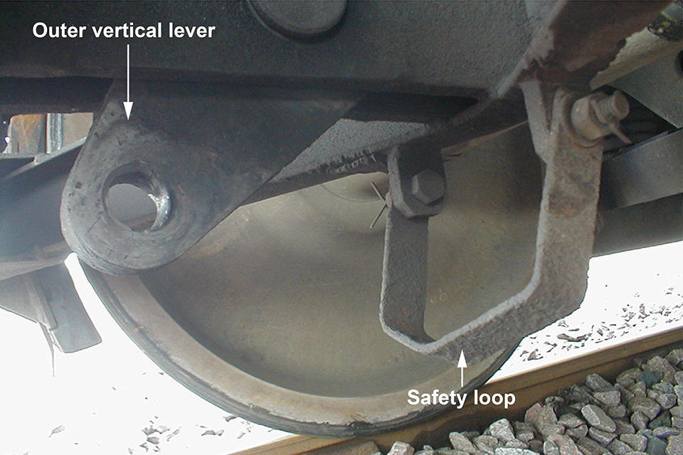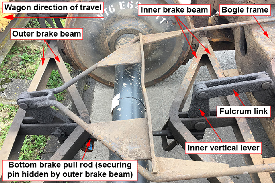 Evidence supporting this sequence of events comprises marks on the track indicative of the bottom brake pull rod bouncing on sleepers, and the deformation of components consistent with the inner end of the bottom brake pull rod exerting significant force on the inner vertical lever and fulcrum link (figure 6).