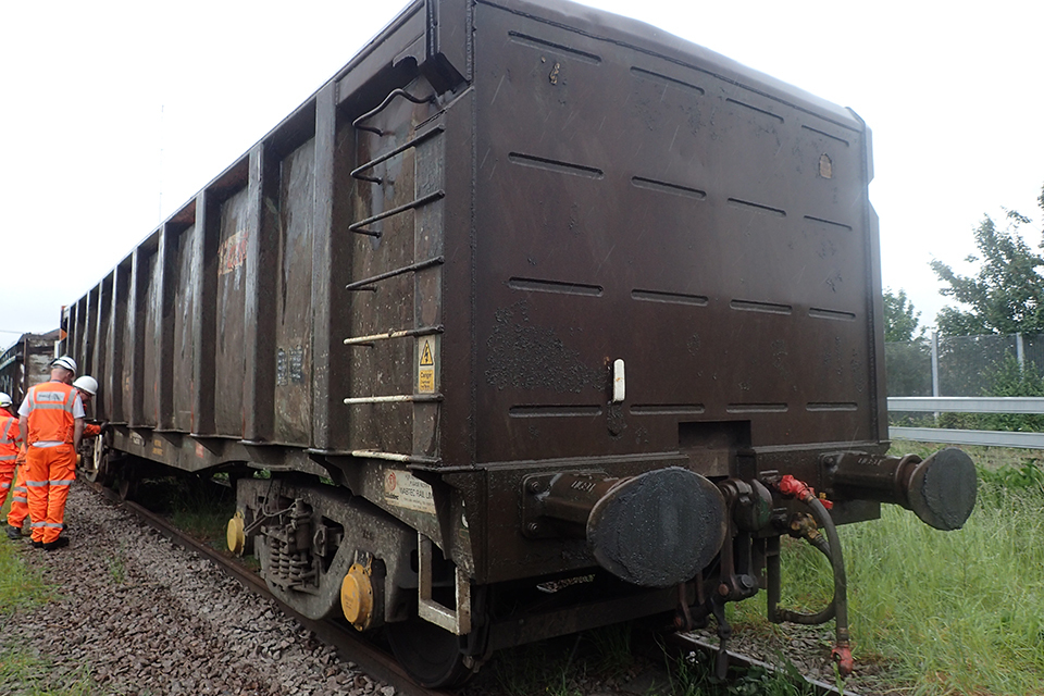 Shortly after the train restarted its journey, a component of the braking system on the seventh wagon became partially detached and began bouncing along the track. Shortly after, as the wagon passed through Carpenters Road North Junction, a substantial part of the wagon’s braking system detached. This equipment fell onto the track, where a trailing wheel on the leading bogie ran over it and derailed.