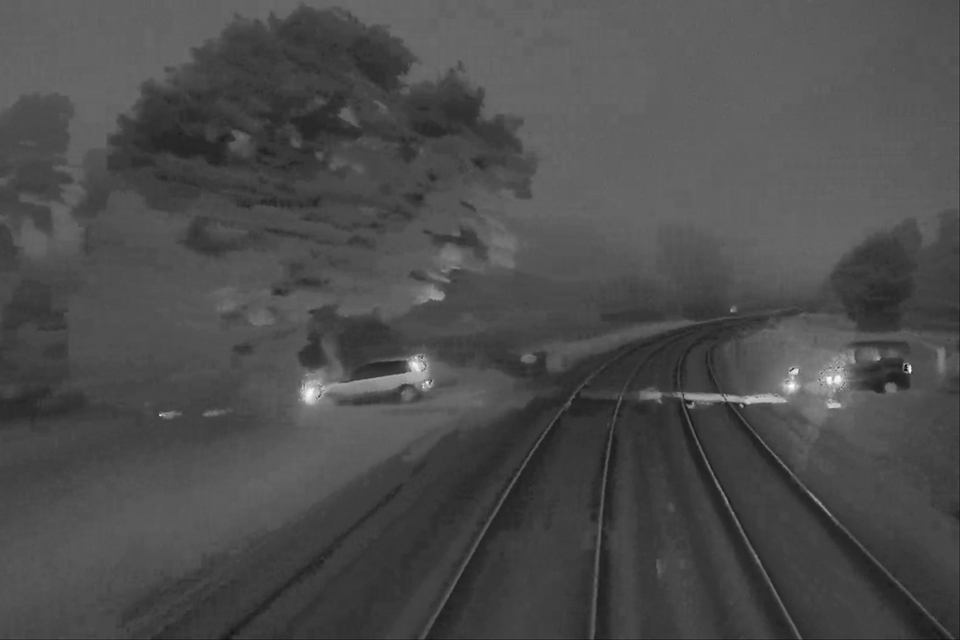 Still image from train 1K55’s forward-facing CCTV, showing the location of the cars (crossing from right to left) at the time of the near miss (image courtesy of Abellio Greater Anglia)