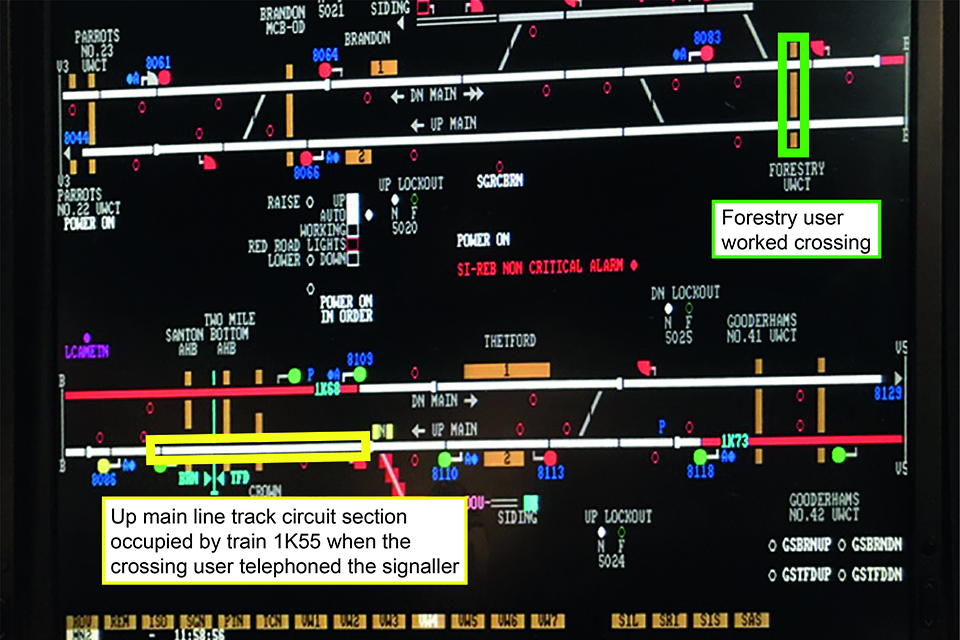 When the crossing user made the request from the crossing, train 1K55 had passed Thetford station and was occupying a track circuit section between the station and Forestry user worked crossing. RAIB calculated that this section is about 5.64 miles (9.08 km) long, meaning that a train travelling at the maximum permitted linespeed of 90 mph (145 km/h) would take around 3 minutes and 46 seconds to traverse its length. On leaving this section, trains approaching the crossing pass into two shorter track circuit sections, before occupying the section which includes Forestry user worked crossing. When he checked the display and gave permission for the users to cross, the signaller believed that train 1K55 had only recently departed from Thetford station and, given the length of that track circuit section, that there would be enough time for the users to cross before the train arrived at the crossing.