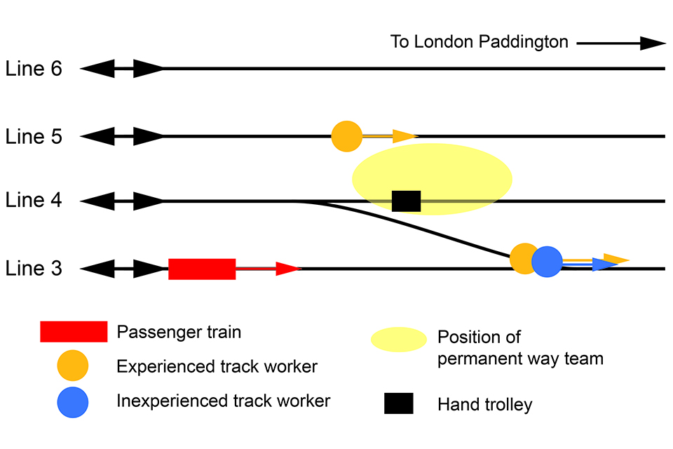 After the PIC/COSS had left them, the three members of the group completed the maintenance of the signal post telephone and began walking back towards Paddington station. One track worker walked in the four-foot (the space between the rails) of line 5, while the other two walked in the four-foot of line 4, as they found that underfoot conditions were better there. Around 47 chains (0.6 miles or 1.0 km) from Paddington station, the group encountered a six-person permanent way team who were also working in the possession and who had placed a hand trolley on line 4. At this point, the inexperienced track worker (wearing a blue helmet) was walking in front of the more experienced members of the team. One of these team members was close behind him on line 4 and the other was around 20 metres behind, on line 5.