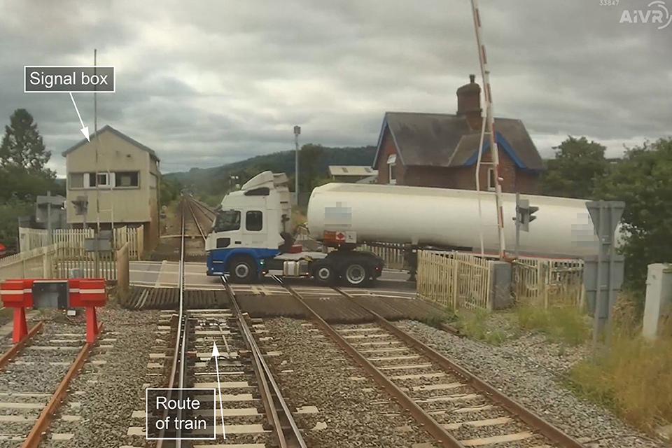 The level crossing was fitted with overrun controls. This meant that, as the train was on the points moving from the Down Goods loop to the Down Main line, the signalling system detected a train approaching with the level crossing open to road traffic and activated the road traffic lights. However, forward-facing CCTV footage from the train shows that that the HGV cab was beyond the road traffic lights when they activated, meaning the HGV driver did not have an opportunity to react to that warning.