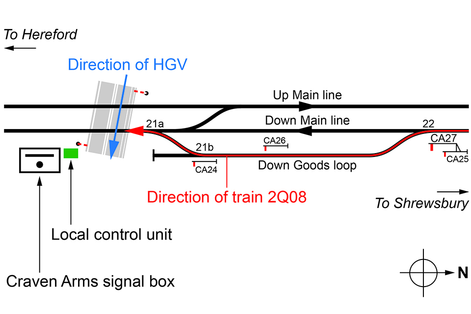 The railway at this location forms part of the Welsh Marches railway line which runs from Shrewsbury to Newport (Gwent). It is composed of three lines aligned in a north/south direction. The line to the east is the Down Goods loop, which has a maximum permissible speed of 15 mph (24 km/h). The middle line is the Down Main line which has a maximum permissible speed of 90 mph (145 km/h). The two down routes converge to the north of the level crossing. The Up Main line on the western side of the railway is not relevant to this incident.