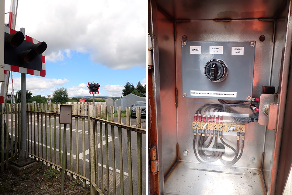 Outside the signal box, next to the level crossing, there is a local control unit (LCU) for the crossing. The LCU has a switch with 3 possible positions which override the commands from the control panel and allow the crossing to be operated in the event of a failure, or to facilitate maintenance activities. The options available at the LCU are ‘raise’, ‘lower’ or ‘normal’. Returning the switch to the normal position returns control to the control panel within the signal box. Use of the LCU will operate the crossing outside of the engineered safeguards provided by the interlocking. For this reason, the LCU should be used only when authorised by the relevant rules and access to it should be controlled.