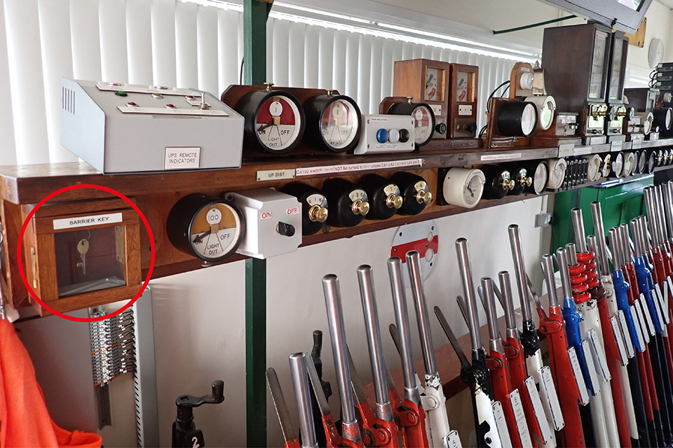 The key to the LCU at Craven Arms signal box is contained within a break-glass box situated above the lever frame to enable access by a signaller or other response staff in the event of a failure. The box is intended to be locked so that it is necessary to break the glass to gain access to the key. In the event of access being required, the signaller should record this in the train register and arrange for the glass to be replaced by the relevant signal and telecoms (S&T) maintenance team. S&T maintenance staff are also issued with keys to LCUs as part of their equipment.