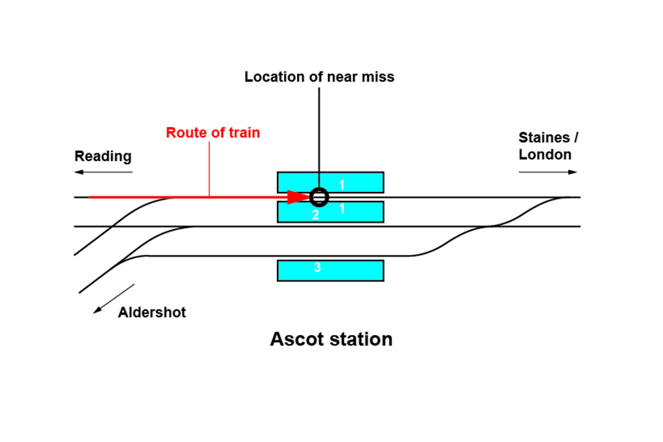 Schematic diagram of track layout at Ascot station showing the path of the train and the location of the near miss