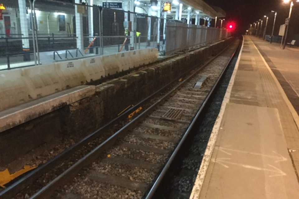 Platform 1 at Ascot station where the work was taking place showing the platform edge and the running line with the third rail(courtesy Network Rail)