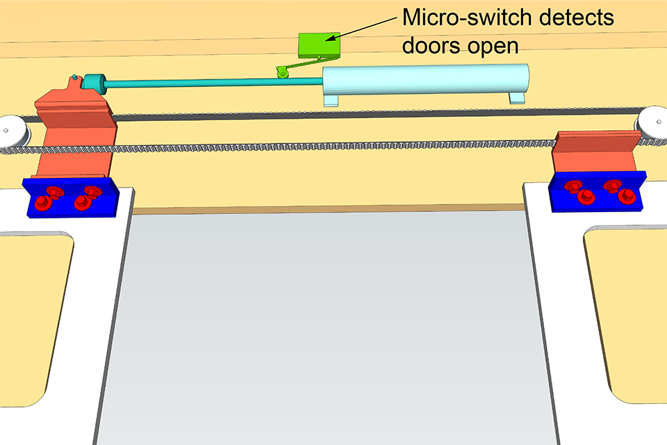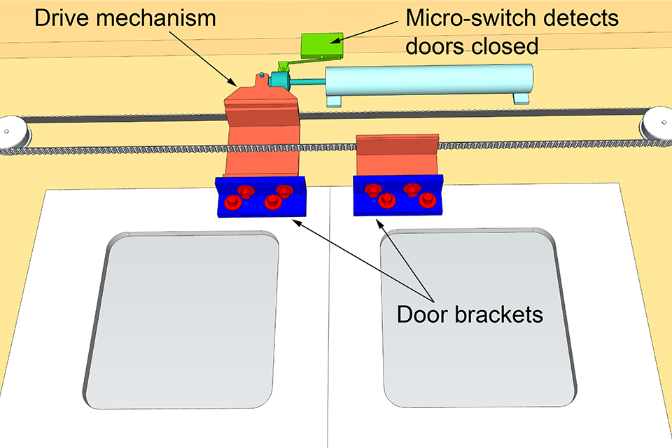 Schematic of door mechanism in the normal condition with doors open (only relevant components shown, not to scale)