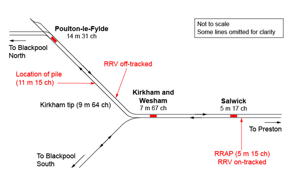 At 01:20 hrs the RRV was on-tracked by the machine operator and crane controller at a Road Rail Access Point (RRAP) at Salwick. They then travelled 4 miles and 45 chains to the first installation site at 9 miles and 60 chains, close to Kirkham and Wesham Tip, arriving at 03:10 hrs. There they met, as planned, two other J Murphy employees, including the supervisor for the installation work.