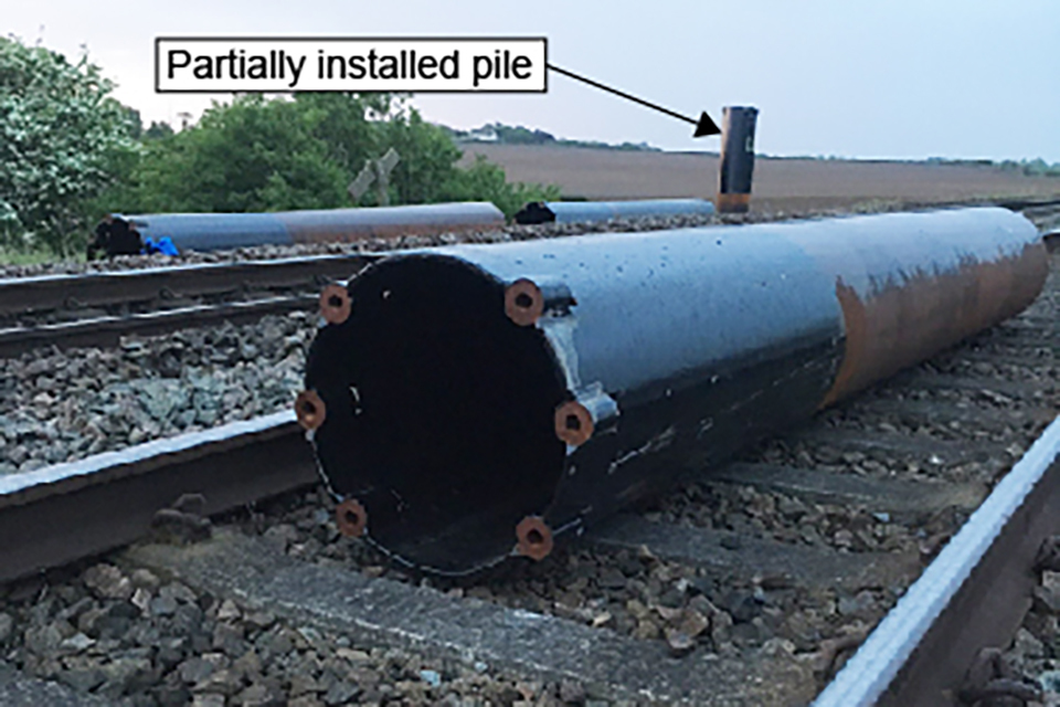 The pile lying in the four foot as found by the tamper driver (image courtesy of Network Rail). The partially installed pile is standing in the cess