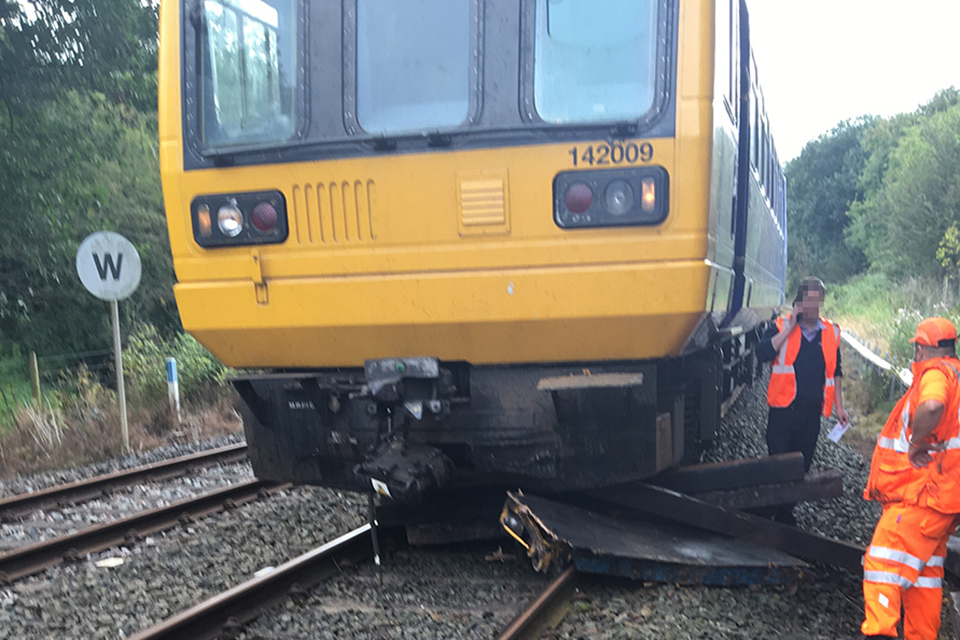 At 09:24 hrs on 25 August 2017 a passenger train collided with three engineering trolleys on the Settle Junction to Carnforth line between Giggleswick and Clapham, in North Yorkshire. The train, 2H08, the 08:18 hrs Northern service from Leeds to Morecambe was travelling on the Down branch line (referred to as the ‘down line’ in this safety digest) at 34 mph (55 km/h). Prior to the collision Network Rail staff had been working on both lines between Settle Junction and Carnforth, moving and positioning sleepers in the cess of the down line, ready for overnight track maintenance work.