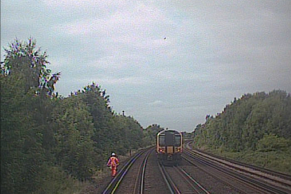 Forward facing CCTV image from the train that struck the track worker, looking towards Raynes Park, showing the rear of the first train having passing the distant lookout (courtesy of South Western Railway)