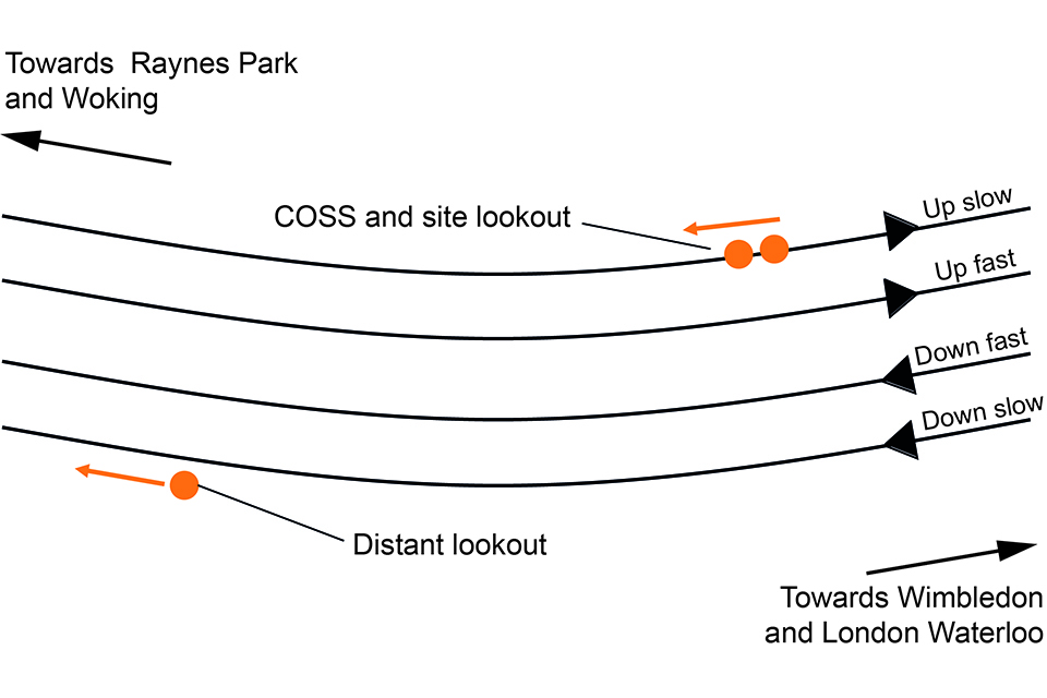 When the group reached Wimbledon they took a break before they began the return journey to Raynes Park. In this direction the COSS was inspecting the up fast and up slow lines from the four-foot of the up slow line. The system of work required a site lookout to be positioned with the COSS, and a distant lookout to be positioned about 200 metres further ahead and adjacent to the down slow line. The role of the distant lookout was to provide advance warning of trains approaching on the up lines because the track curvature restricted the site lookout’s view.