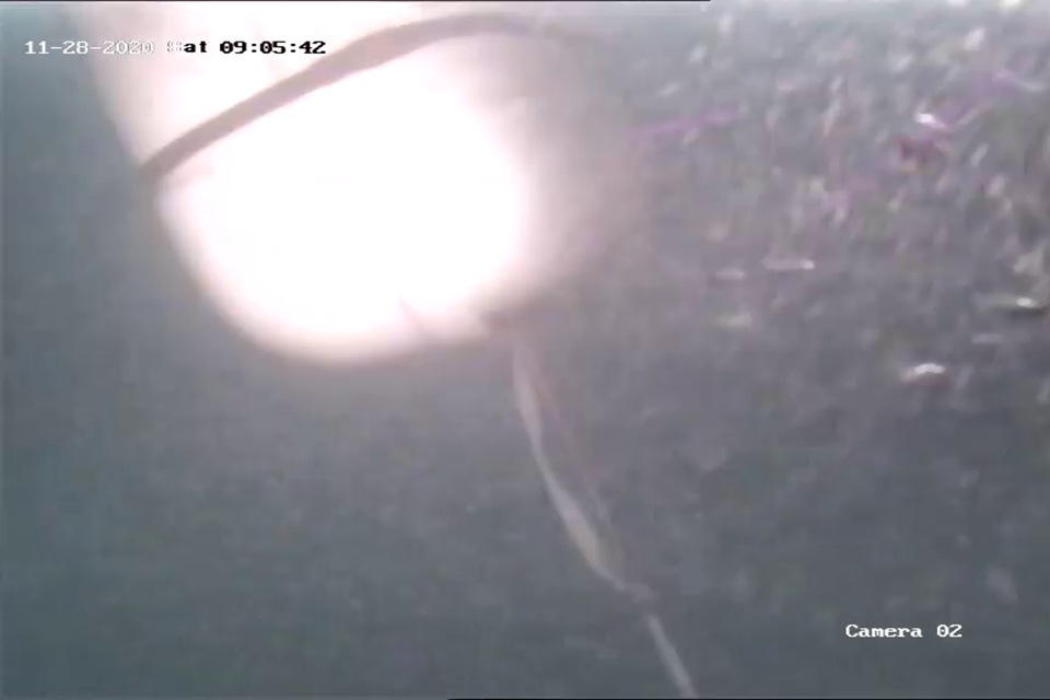Still from dive survey video showing that the liferaft had been released from the cradle and was floating, uninflated at the end of the painter. The bottom of the canister can be seen in the top-left of the image