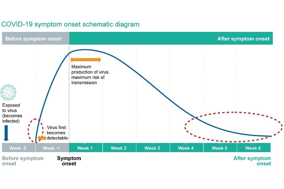 Currently, problems of interpretation are seen particularly in relation to positive results at the limit of detection. The schematic diagram below (adapted from BMJ Learning) illustrates the detection of SARS-CoV-2 RNA (shown by the blue line). Timings of symptom onset and virus detection in relation to infection will vary from person to person, but will broadly fit within this representation. Positive results at the limit of detection can be seen in the early stages of infection (before the person becomes capable of transmission of the infection) or late in infection when the risk of transmission is low or very low (periods indicated by the dotted red line).