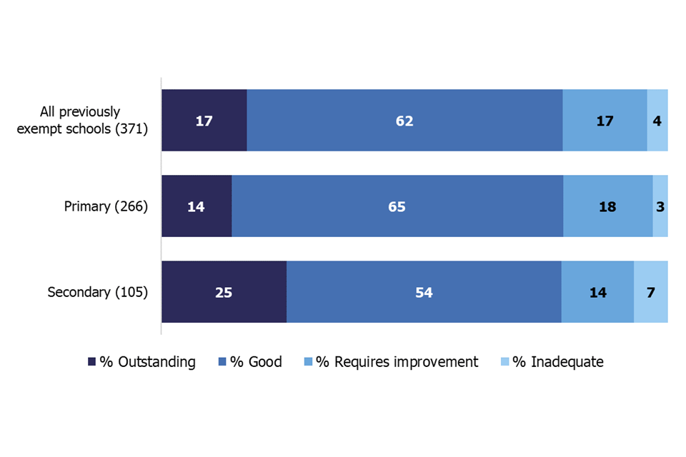 When the exemption ended, 43% of the 3,400 exempt schools had not had a graded inspection for at least 10 years, as their last graded inspection was between September 2005 and August 2010. A further 38% had gone between 5 and 10 academic years (last inspected 2010 to 2015). Since their last inspection, many of these schools will have had a new headteacher, new governors, and (especially the secondary schools) become part of an academy trust.